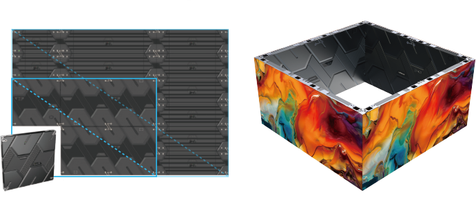 1)250*250mm模組尺寸,可實(shí)現(xiàn)整米尺寸安裝;6種箱體可任意搭配使用,250mm倍數(shù)的屏體都可滿足。