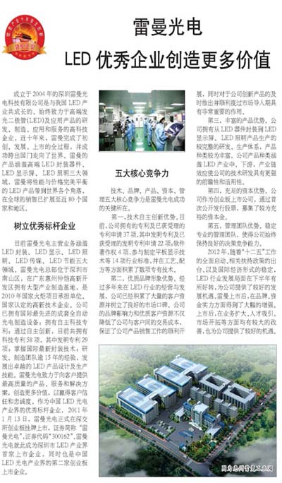 目前雷曼光電主營業(yè)務涵蓋LED封裝、LED顯示、LED照明、LED傳媒、LED節(jié)能五大領域。雷曼光電總部位于深圳市南山區(qū),在廣東惠州仲愷高新開發(fā)區(qū)擁有大型產業(yè)制造基地,是2010年國家火炬項目承擔單位、國家認定的高新技術企業(yè)。公司擁有國際最先進的成套全自動光電制造設備;擁有自主科技專利;通過自主創(chuàng)新,目前共擁有科技專利58項,其中發(fā)明專利29項;掌握國際最新封裝技術;研發(fā)、制造團隊有逾15年的經驗,發(fā)展出卓越的LED產品設計及生產技能。雷曼光電致力于向客戶提供最高質量的產品、服務和解決方案,創(chuàng)造更多價值,以贏得客戶信任和忠誠度。作為中國LED光電產業(yè)界的優(yōu)秀標桿企業(yè),2011年1月13日,雷曼光電正式在深交所創(chuàng)業(yè)板掛牌上市,證券簡稱“雷曼光電”,證券代碼“300162”。雷曼光電就此成為深圳市LED產業(yè)界首家上市企業(yè),同時也是中國LED光電產業(yè)界的第二家創(chuàng)業(yè)板上市企業(yè)。