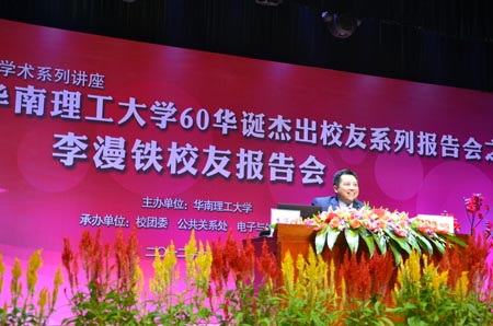 時(shí)逢華南理工大學(xué)60周年“甲子”校慶,作為本次校慶活動(dòng)的重要內(nèi)容“60華誕杰出校友報(bào)告會(huì)”,應(yīng)華南理工大學(xué)校領(lǐng)導(dǎo)、校友總會(huì)盛情邀請,李漫鐵董事長于11月1日重返母校,與在校師生共同分享了一場主題為“磨礪自身,成就夢想”的報(bào)告演講。