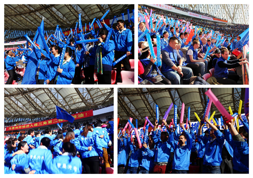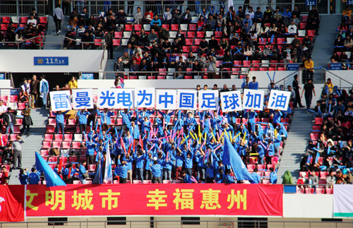 下午15:00比賽正式開始,現(xiàn)場人聲鼎沸、熱鬧非凡。位于觀眾席11區(qū)200名身著藍(lán)色活動(dòng)服的雷曼方陣格外引人注目。高舉的條幅“雷曼光電?;浉劢河聤Z佳績”表達(dá)了雷曼人對此次比賽的美好祝愿,而雙面助威看板“雷曼光電為中國足球加油”、“中國夢 足球夢 攜手共圓夢”更是體現(xiàn)了雷曼人對中國足球的高度關(guān)注與祝福。鼓點(diǎn)聲聲、助威棒高舞,整齊劃一的口號與動(dòng)作,更是感染了現(xiàn)場觀眾。當(dāng)運(yùn)動(dòng)員進(jìn)場時(shí),雷曼人搖旗吶喊“春風(fēng)吹、戰(zhàn)鼓擂,省港健兒誰怕誰”的口號迎接球員們。而比賽過程中綠茵場上廣東隊(duì)與香港隊(duì)進(jìn)行著激烈的拼搶,觀眾席上吶喊聲、歡呼聲此起彼伏。雷曼人用特有的激情為廣東、香港運(yùn)動(dòng)員加油,為中國足球加油。