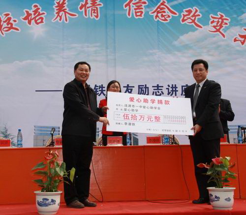 漫步校園,面對母校滿目蔥蘢的綠意和掩映其中的現(xiàn)代建筑群體,回想昔日的寒窗苦讀生活,李董事長校友臉上掩飾不住澎湃的心情,話語也多了幾許。第二天舉行的漣源一中82級部分校友座談會(huì)上,李漫鐵董事長校友表示:感恩母校老師培養(yǎng)情,我為母校捐資50萬元,這是我個(gè)人的第一筆捐款。并將盡己所能籌集更多的愛心助學(xué)款,獎(jiǎng)勵(lì)優(yōu)秀學(xué)生,資助家庭困難學(xué)生完成高中學(xué)業(yè),促進(jìn)母校的繁榮發(fā)展。