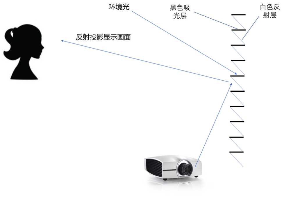 激光投影抗光幕示意圖如圖所示,抗光幕微結(jié)構(gòu)為鋸齒狀的光學(xué)結(jié)構(gòu),鋸齒結(jié)構(gòu)上方為涂覆黑色材料的吸光層,下方為涂覆特殊材料的白色反光層。黑色層可以吸收環(huán)境光,提高對(duì)比度,白色反光層用于投影時(shí)反射圖像。從抗光幕的微結(jié)構(gòu)可以發(fā)現(xiàn),幕布無法實(shí)現(xiàn)全部黑色,還有相當(dāng)一部分白色,導(dǎo)致幕布的對(duì)比度不高,無法實(shí)現(xiàn)高品質(zhì)的畫面顯示。
