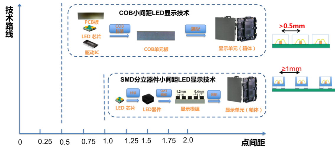SMD小間距顯示與COB微間距顯示能實(shí)現(xiàn)的點(diǎn)間距范圍比較