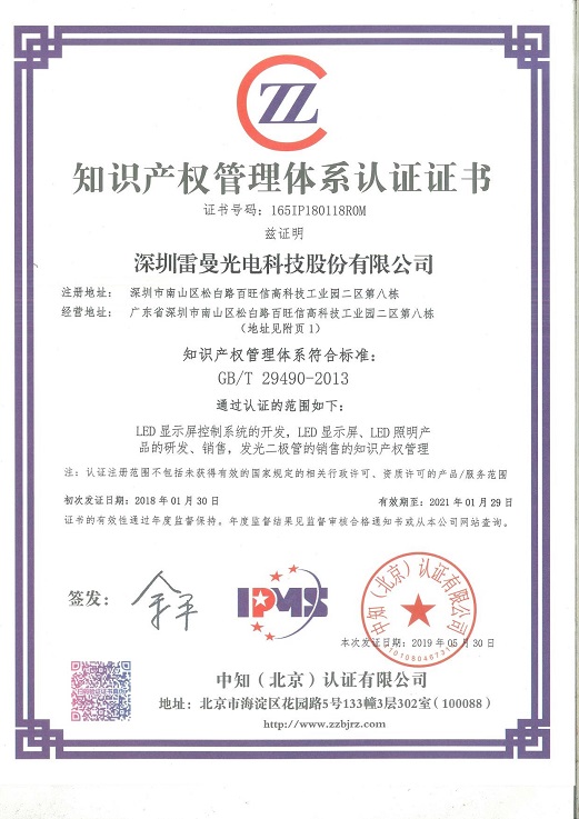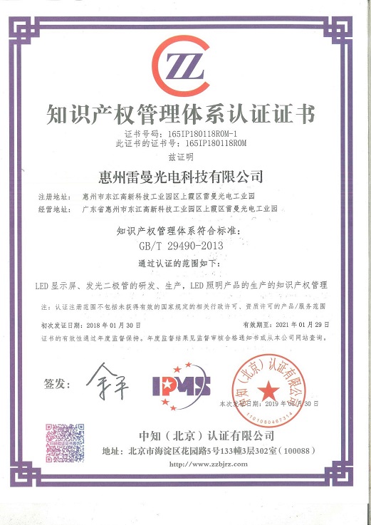2019年6月4日,根據(jù)中國國家認(rèn)證認(rèn)可監(jiān)督管理委員會(huì)(簡稱:CNCA)的有關(guān)規(guī)定和國標(biāo)《GB/T9490-2013企業(yè)知識(shí)產(chǎn)權(quán)管理規(guī)范》的標(biāo)準(zhǔn)要求,深圳雷曼光電科技股份有限公司(以下簡稱:雷曼光電)及其全資子公司惠州雷曼光電科技有限公司(以下簡稱:惠州雷曼)以其完整規(guī)范的知識(shí)產(chǎn)權(quán)管理流程及對規(guī)范有效深入的實(shí)踐,順利取得中知(北京)認(rèn)證有限公司頒發(fā)的《知識(shí)產(chǎn)權(quán)管理體系母子證書》。