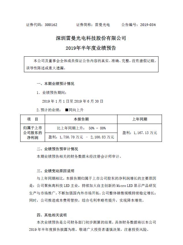 雷曼光電7月9日晚間披露業(yè)績預(yù)告,預(yù)計上半年凈利1750.7萬元–2100.83萬元,同比增長50%-80%。公司持續(xù)加大自主創(chuàng)新的Micro LED顯示產(chǎn)品研發(fā)生產(chǎn)與市場推廣,不斷加強(qiáng)國內(nèi)外市場開拓,公司整體銷售規(guī)模持續(xù)穩(wěn)定增長。