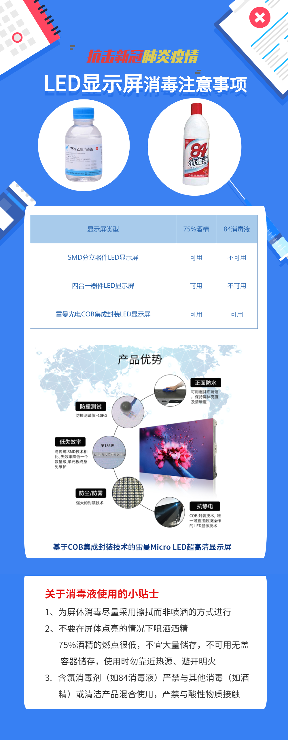 近期,雷曼光電的很多COB顯示屏客戶,來電咨詢COB顯示屏能否用消毒液進(jìn)行屏體表面消毒,為了解答客戶的疑問,雷曼光電的技術(shù)人員進(jìn)行了仔細(xì)的分析與測試,實驗結(jié)果證明,雷曼COB顯示屏的超強可靠性與防護(hù)性使得它可以有效防止消毒液對屏幕的傷害。