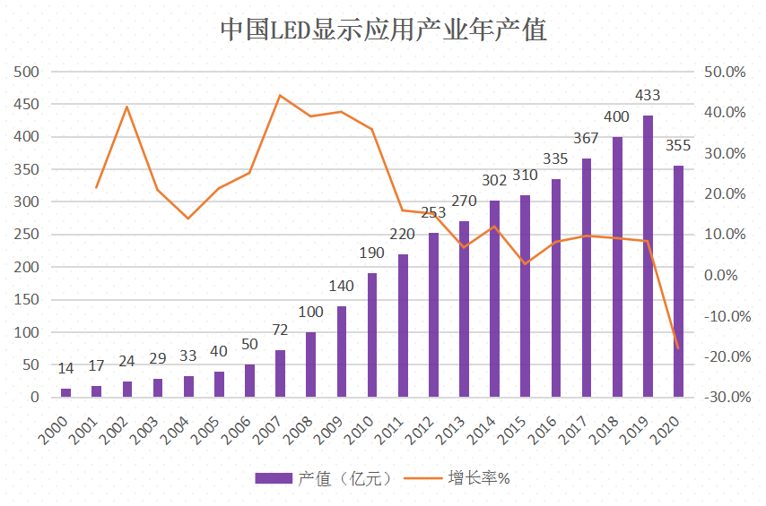 相關(guān)機構(gòu)數(shù)據(jù)顯示,2020年全球LED市值總額約為151.27億美元(約合987.49億元人民幣),同比下降約10.2%;LED晶圓市場容量約為2884.6萬片,同比下降約5.7%。其中我國LED顯示應(yīng)用產(chǎn)業(yè)全年產(chǎn)值預(yù)計下降約18%,達355億元。