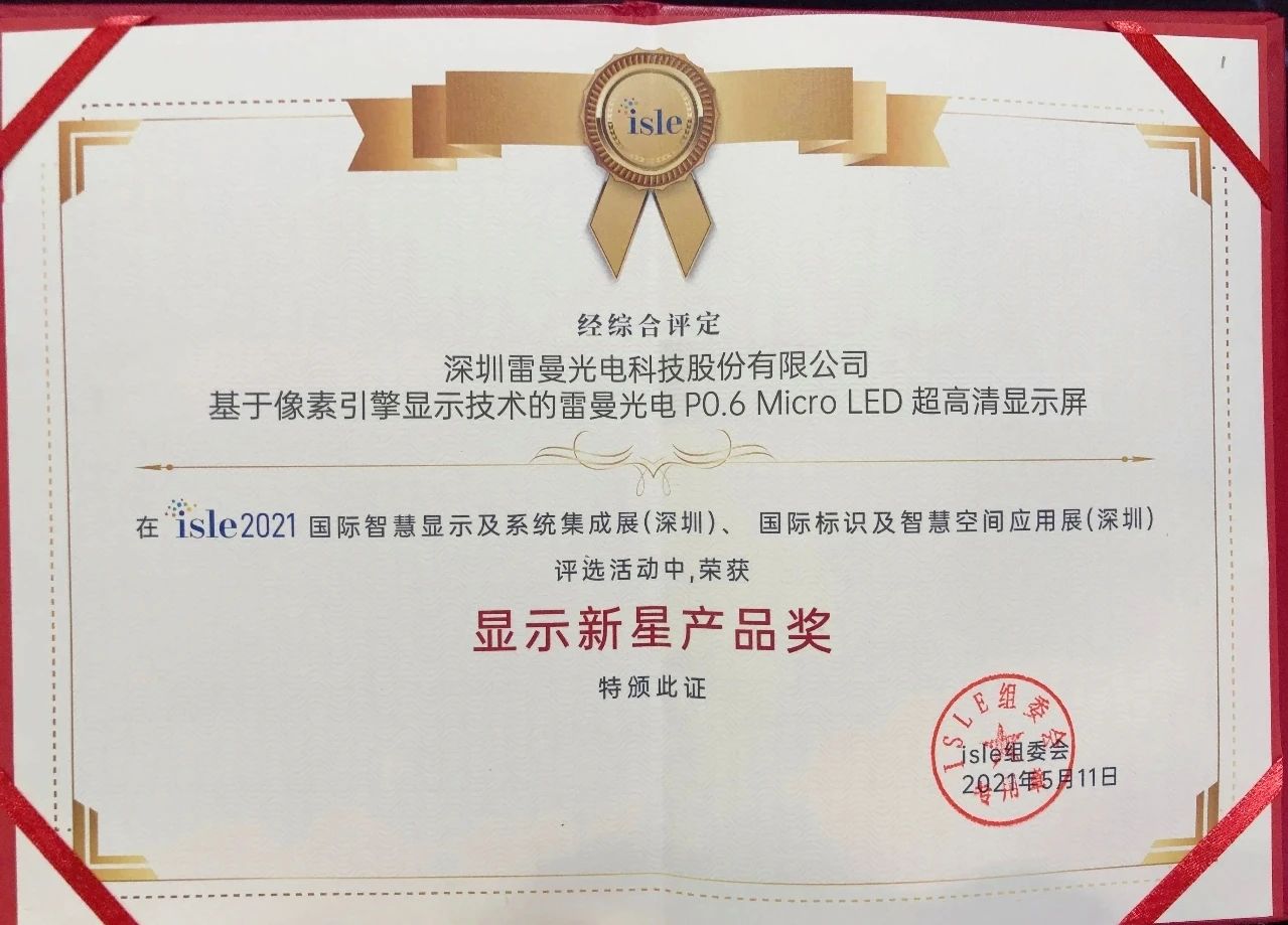 雷曼光電獲得各項(xiàng)大獎(jiǎng)是廣大客戶及合作伙伴及權(quán)威專家、協(xié)會(huì)對(duì)雷曼光電LED超高清顯示產(chǎn)品、創(chuàng)新精神與助推行業(yè)技術(shù)高質(zhì)量發(fā)展的認(rèn)可與肯定。雷曼光電將不忘初心,精進(jìn)引領(lǐng)行業(yè)變革的先進(jìn)顯示技術(shù),為行業(yè)及產(chǎn)業(yè)加速發(fā)展貢獻(xiàn)力量。