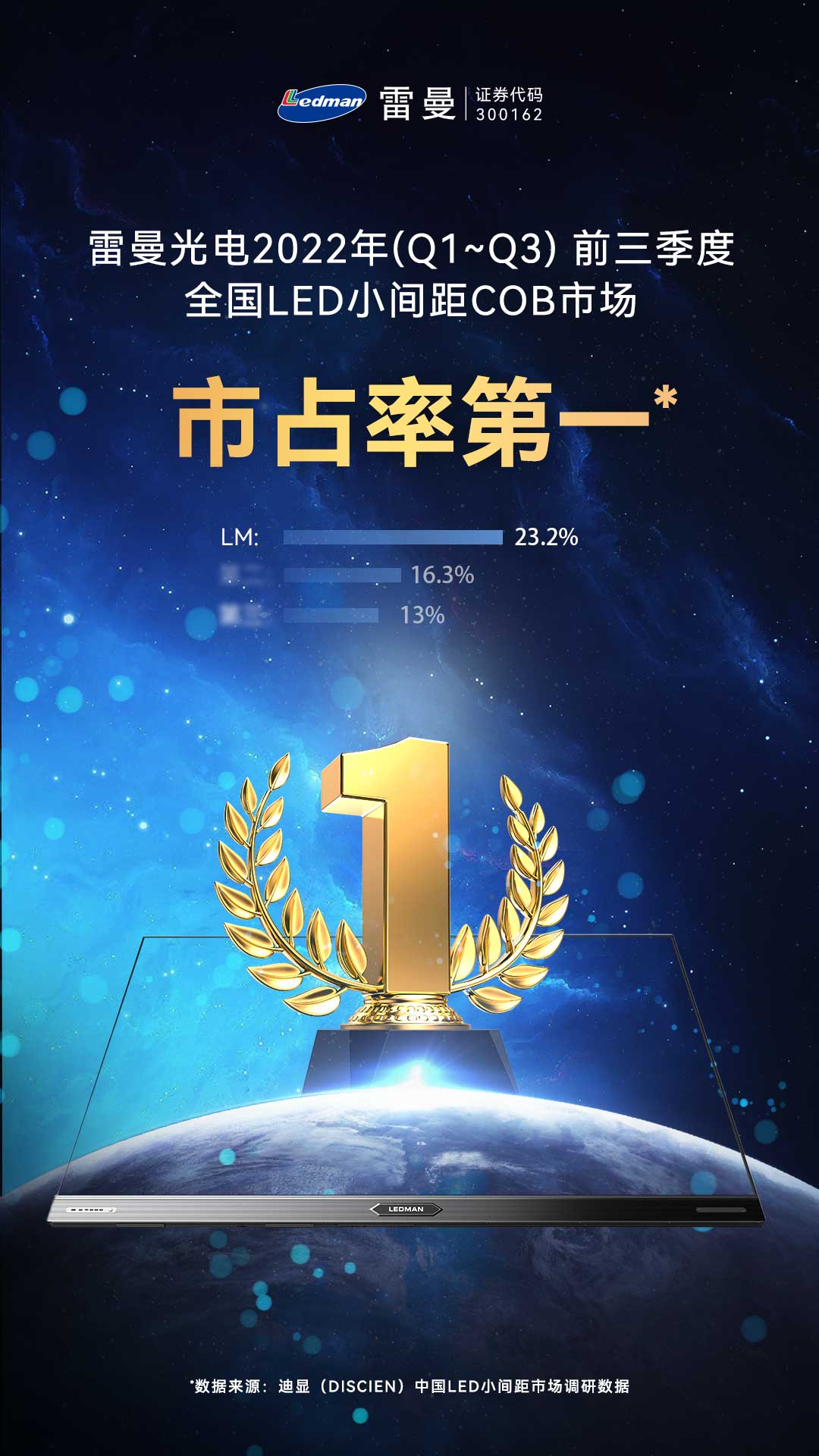 近日,權(quán)威機(jī)構(gòu)迪顯(DISCIEN)發(fā)布《中國LED小間距市場(chǎng)研究報(bào)告》。根據(jù)迪顯中國LED小間距市場(chǎng)調(diào)研數(shù)據(jù)顯示,在中國大陸地區(qū)LED小間距COB市場(chǎng),雷曼2022年(Q1-Q3)前三季度銷售額&銷售量均位居行業(yè)第一。目前雷曼在COB細(xì)分領(lǐng)域的市場(chǎng)占有率繼續(xù)穩(wěn)居第一。