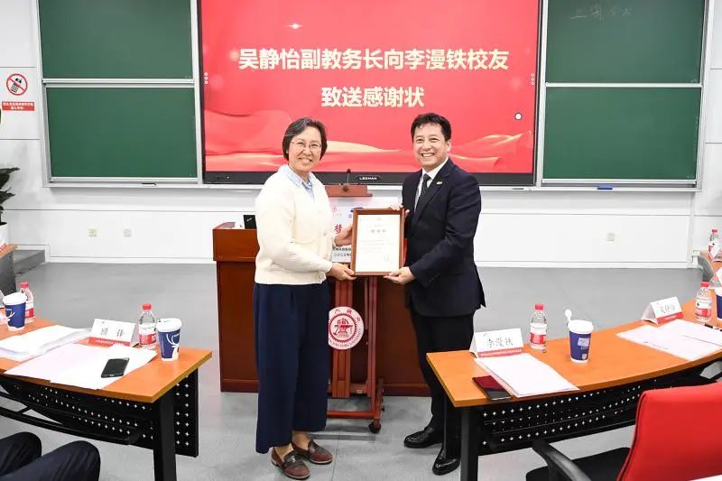 顧鋒與李漫鐵共同為智慧教室教育顯示系統(tǒng)揭幕,并頒發(fā)捐贈證書。吳靜怡向李漫鐵致感謝狀。