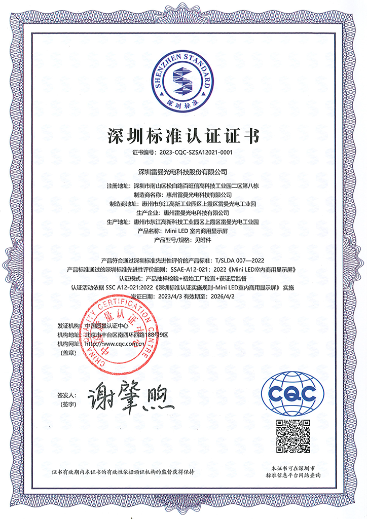 深圳市正在大力培育發(fā)展智能終端產(chǎn)業(yè)和超高清視頻顯示產(chǎn)業(yè)集群,而標準化工作對推動超高清視頻顯示產(chǎn)業(yè)高質(zhì)量發(fā)展具有非常重要的戰(zhàn)略意義。雷曼超高清顯示系列產(chǎn)品色彩細膩,畫面表現(xiàn)能力更佳,在色域重合度、灰度等級、刷新頻率、亮度視角、墨色一致性等方面均達到了嚴格的先進性指標。雷曼獲得“深圳標準認證”,是對雷曼嚴于國家行業(yè)標準、具備卓越品質(zhì)的超高清顯示系列產(chǎn)品的權(quán)威認證。