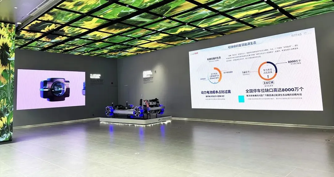 進入館內(nèi),首先映入眼簾的便是展陳的炫酷明星車型以及背景大屏,大屏采用一塊COB小間距屏、兩塊透明冰屏,超清畫質(zhì)與通透畫面組合顯示,向訪客呈現(xiàn)廣汽的品牌發(fā)展歷程、數(shù)字孿生平臺與埃安車輛運營數(shù)據(jù)。