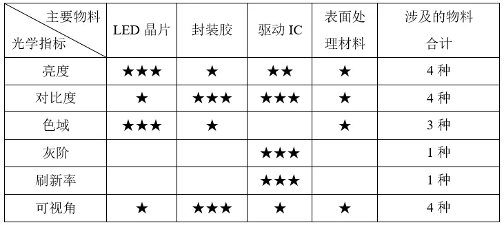 表2、光學(xué)指標(biāo)與主要物料設(shè)計(jì)關(guān)系圖