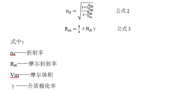折射率主要受材料分子量與分子結(jié)構(gòu)及固有摩爾折射率的影響,這符合Lorentz-Lorenz 關(guān)系式,如式 2,3 所示