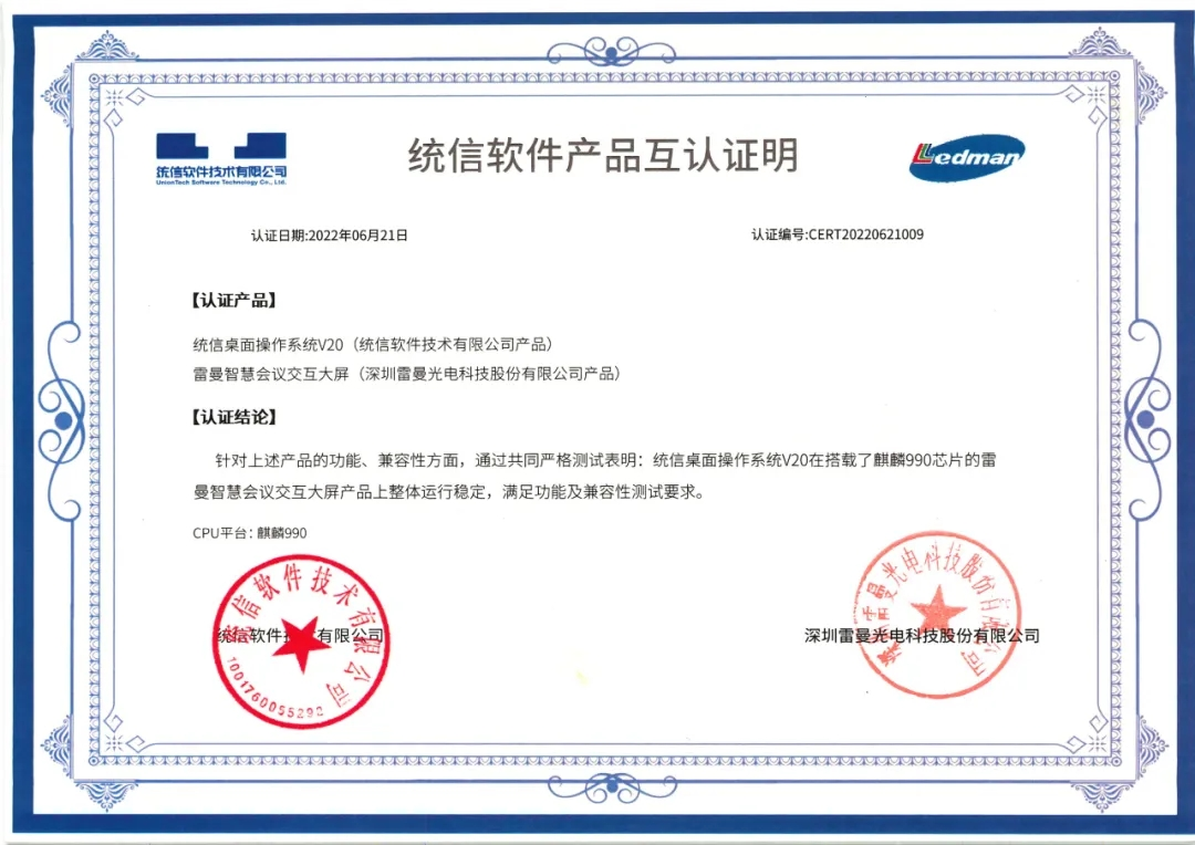 在數(shù)據(jù)安全方面,雷曼智慧會議一體機已通過統(tǒng)信軟件產(chǎn)品認證,獲得代表性國產(chǎn)化軟件產(chǎn)品的互認證明,滿足政府、保密單位、央國企單位對操作系統(tǒng)國產(chǎn)化的要求。雷曼智慧會議一體機與信創(chuàng)產(chǎn)品的融合也將有助于提高政務(wù)信息安全水平,提高政務(wù)工作信息安全保障。