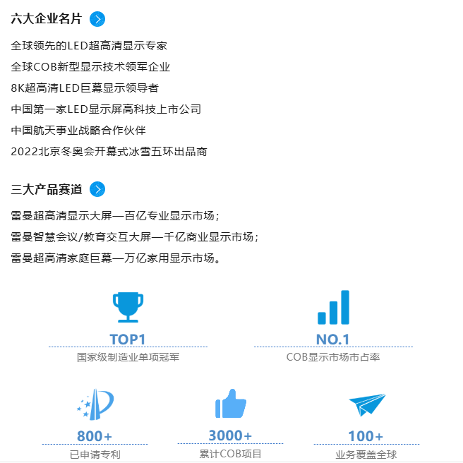 深圳雷曼光電科技股份有限公司(證券簡稱:雷曼光電,證券代碼:300162)成立于2004年,雷曼光電專注于8K超高清視頻產(chǎn)業(yè),助力5G+8K發(fā)展,以基于COB先進(jìn)技術(shù)的8K Micro LED超高清顯示產(chǎn)品為龍頭,聯(lián)動打造LED全系列產(chǎn)品和解決方案生態(tài)。按品牌計,雷曼光電2021年至2023年度在LED小間距COB顯示市場市占率位居第一,并獲評國家級制造業(yè)單項冠軍。