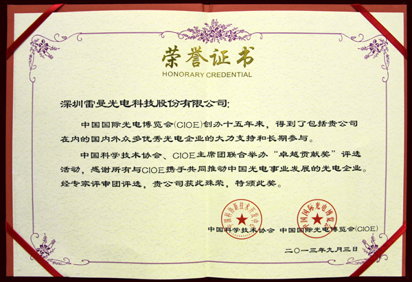 今年是中國國際光電博覽會創(chuàng)辦的第十五年,為了加強(qiáng)與光電企業(yè)和產(chǎn)業(yè)的聯(lián)系與合作,反映光電科技的進(jìn)步,促進(jìn)光電產(chǎn)業(yè)的發(fā)展,中國科學(xué)技術(shù)協(xié)會與中國國際光電博覽會主席團(tuán)聯(lián)合舉辦了“卓越貢獻(xiàn)獎”評選活動,雷曼光電作為國內(nèi)LED行業(yè)的引領(lǐng)者憑借著為中國光電行業(yè)做出的努力和貢獻(xiàn)而收獲殊榮。