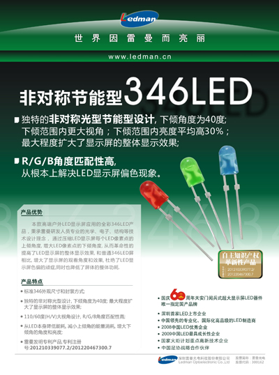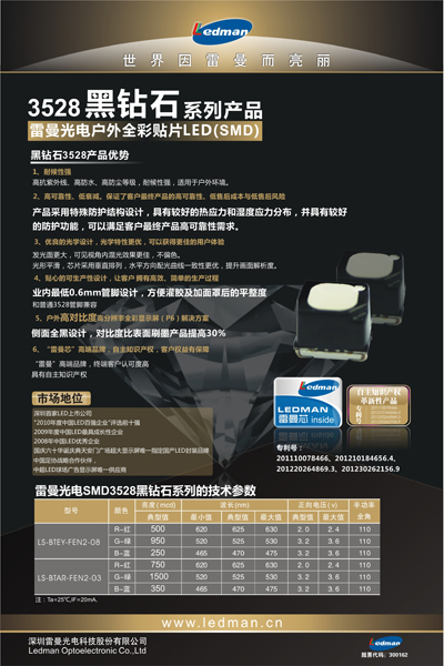 本次展會(huì)上,雷曼光電將在中國(guó)國(guó)際展覽中心E2館內(nèi)G28展位上打造一個(gè)高端展示平臺(tái),其展品包括LED戶內(nèi)外顯示屏、LED封裝器件新產(chǎn)品、LED新產(chǎn)品對(duì)比箱體等。其中最值得關(guān)注和期待的是2013年最新發(fā)布的兩款戶外全彩LED封裝器件新產(chǎn)品,它們分別是:獲得兩項(xiàng)國(guó)家專利并于2013年3月在“第五屆中國(guó)LED行業(yè)(2012)年度評(píng)選”中榮獲“2012中國(guó)LED創(chuàng)新產(chǎn)品和技術(shù)獎(jiǎng)”的全彩LED顯示屏器件產(chǎn)品——非對(duì)稱節(jié)能型戶外346全彩LAMP器件產(chǎn)品和歷時(shí)3年時(shí)間,累計(jì)投入近1500萬(wàn)元研發(fā)費(fèi)用研制出品的戶外 全彩SMD3528新黑鉆石產(chǎn)品。雷曼光電戶外346全彩LAMP和市場(chǎng)上普通的346LAMP相比,可節(jié)能30%,具有下傾可視角度大,光匹配性好,對(duì)比度高等特點(diǎn),是戶外樓宇固定安裝屏的一個(gè)完美解決方案。雷曼光電新黑鉆產(chǎn)品采用特殊防護(hù)結(jié)構(gòu)設(shè)計(jì),其結(jié)構(gòu)設(shè)計(jì)和材料特性具有優(yōu)良的抗熱應(yīng)力和濕度應(yīng)力,可以滿足在惡劣環(huán)境中長(zhǎng)時(shí)間應(yīng)用的需求。為滿足戶外顯示屏的灌膠和面罩工藝對(duì)于平整度的要求,新黑鉆的PIN腳采用低PIN腳設(shè)計(jì)(0.6mm),也是目前戶外全彩SMD器件市場(chǎng)上唯一一款低PIN腳設(shè)計(jì)方案。